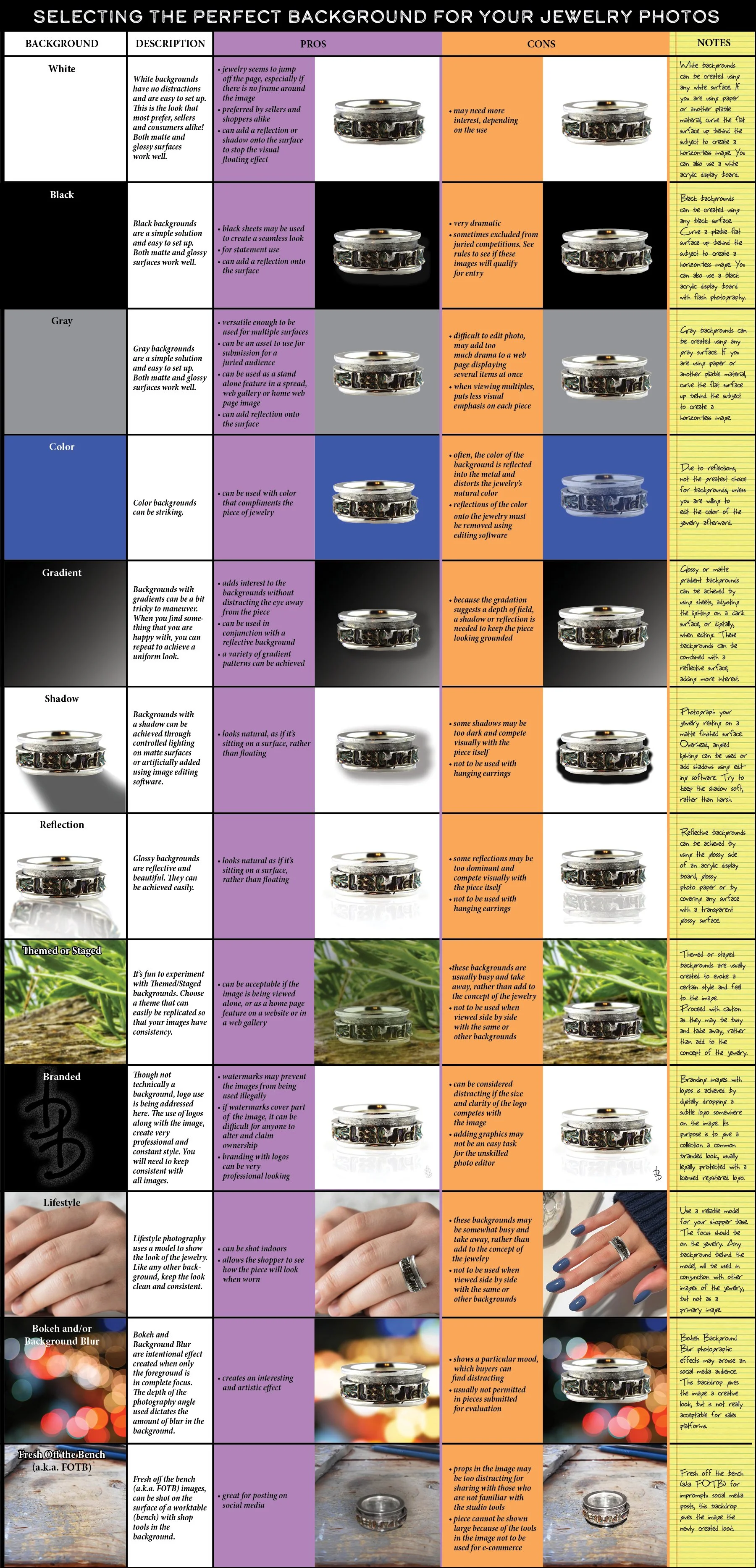 Many have submitted images to me for editing. Almost always, I send them back to the drawing board (camera) with specific instructions regarding the background of their jewelry images. There are so many to chose from, but selecting the best background is always a good place to start. I have devised a chart, along with pros and cons, that should help simplify choosing the best option to meet the needs of your images.